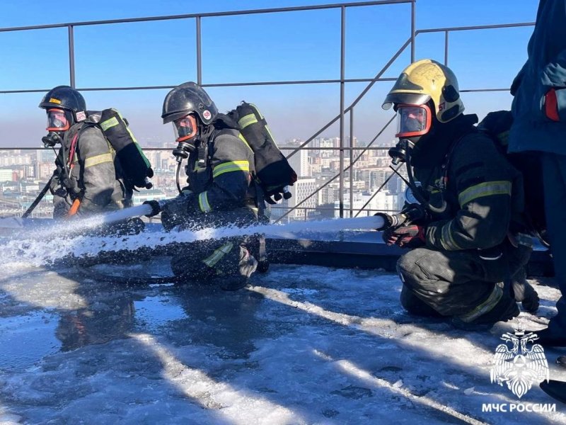 Пожарные МЧС России провели пожарно-тактические занятия в жилом многоэтажном доме в Центральном районе Новосибирска. По легенде учений на крыше 25-этажного здания произошло условное возгорание, необходимо проложить рукавную линию на высоту и ликвидировать пожар.