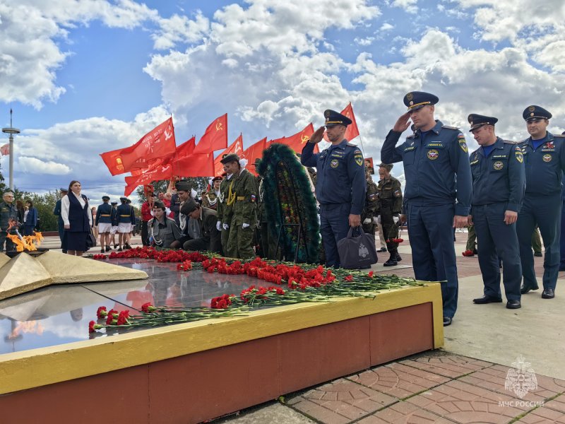 В завершение торжественной церемонии сотрудники МЧС России возложили цветы к Вечному огню, почтив минутой молчания память всех воинов, павших в боях за свободу и независимость Родины. Информационное агентство "МедиаХот"